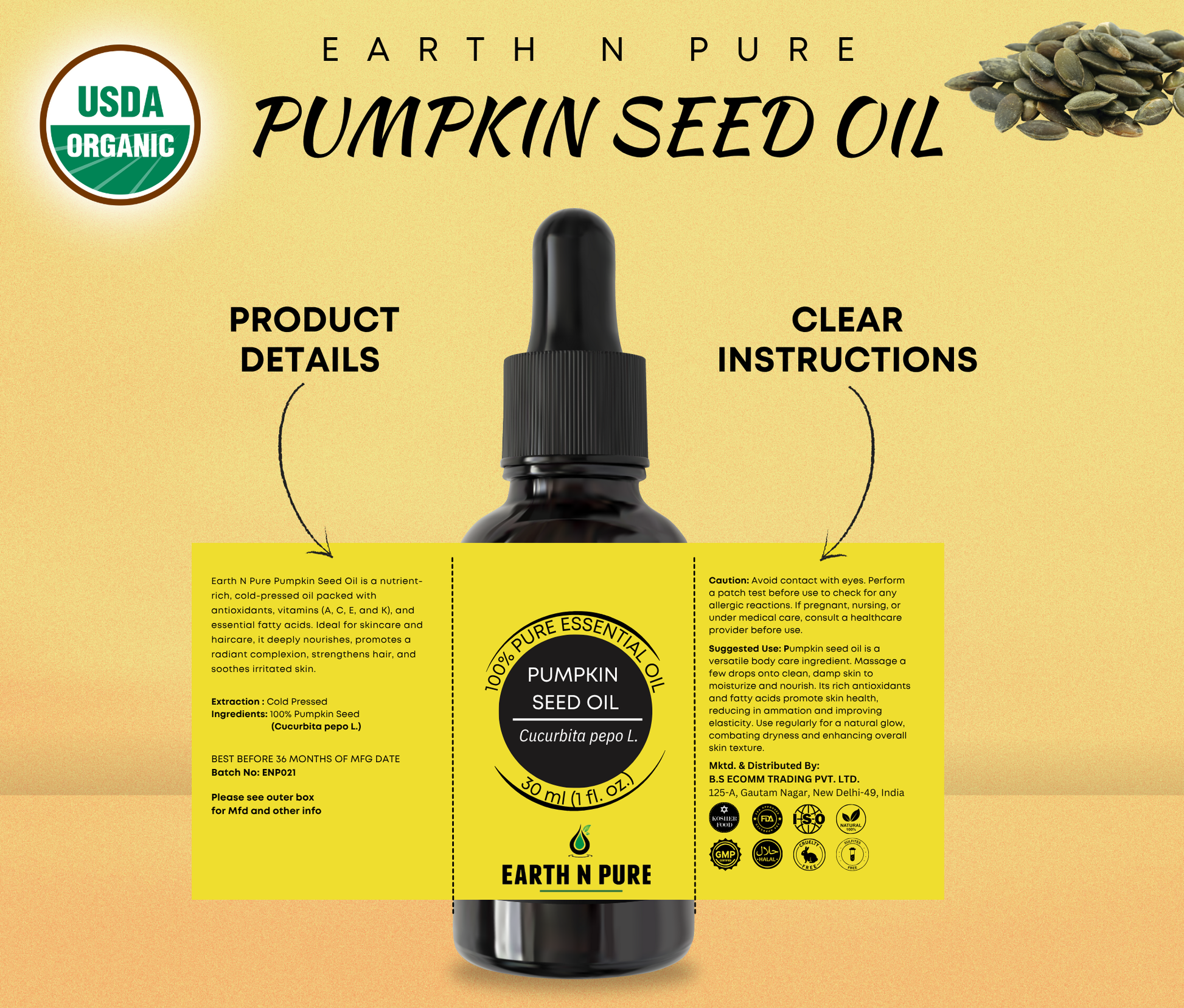 Earth N Pure Pumpkin Seed Oil is 100% natural, cold-pressed, and rich in essential nutrients to nourish hair, skin, and overall wellness. Packed with antioxidants, vitamins, and fatty acids, this pure pumpkin seed oil promotes hair growth, strengthens follicles, moisturizes skin, and supports heart and prostate health. Ideal for daily self-care routines, it can be used for massage, skincare, and hair treatments. Enhance your beauty and wellness naturally with this premium cold-pressed oil.